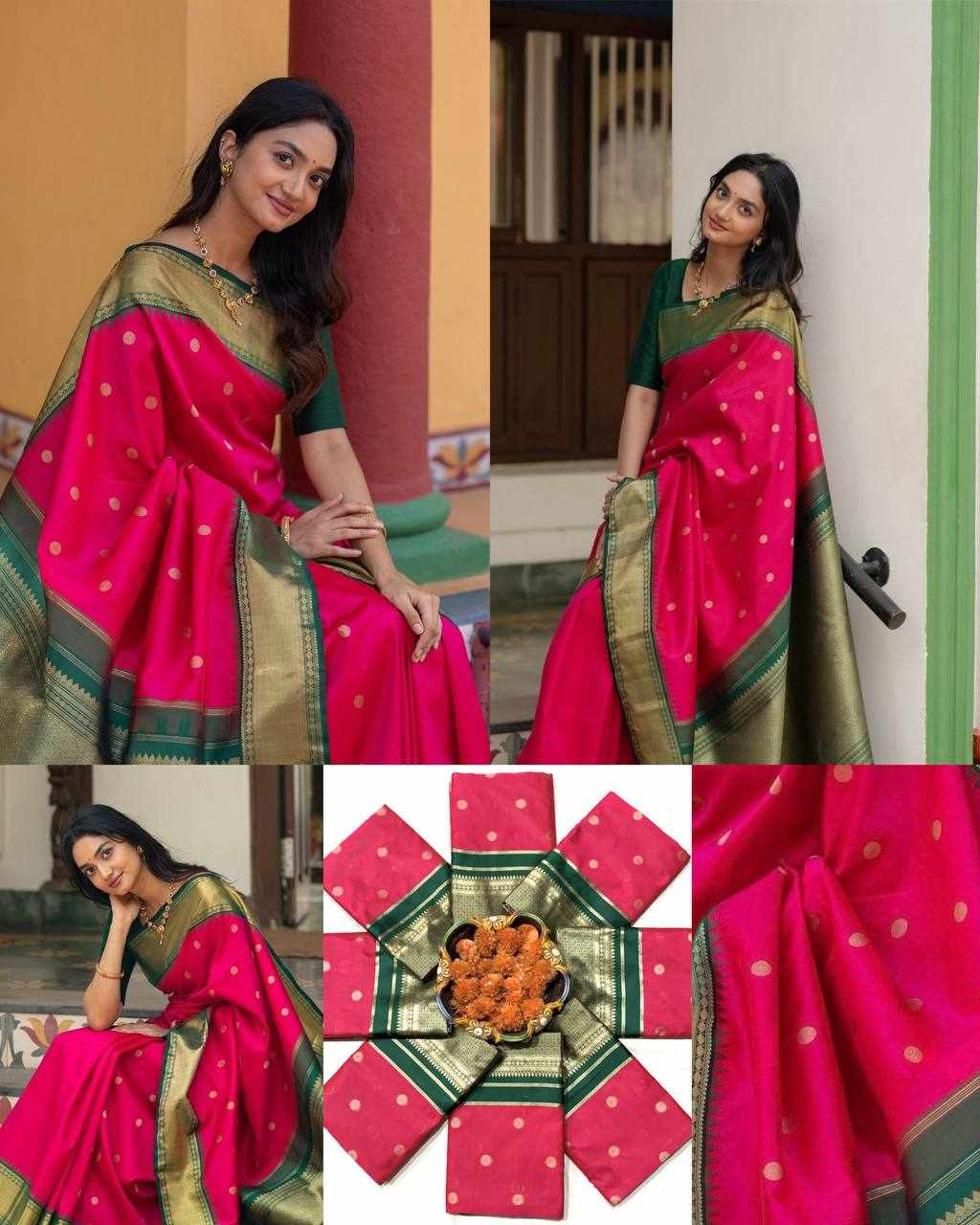 Design: Beautiful rich pallu with elegant jacquard work woven all over the saree, giving a graceful and luxurious appeal